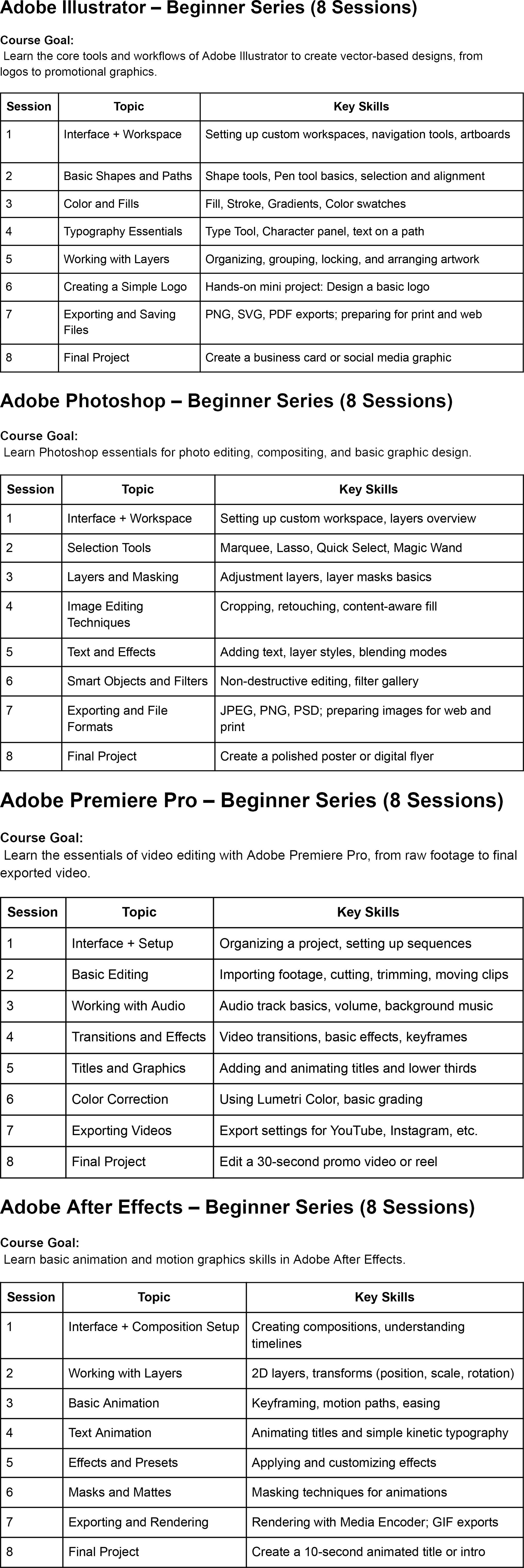 Explore each syllabus below to see the full breakdown of what you’ll learn in every 8-session series.
